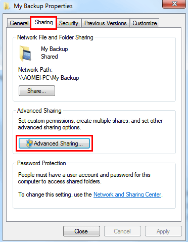 Step 2. Click the Sharing tab and click the Advanced Sharing... option.