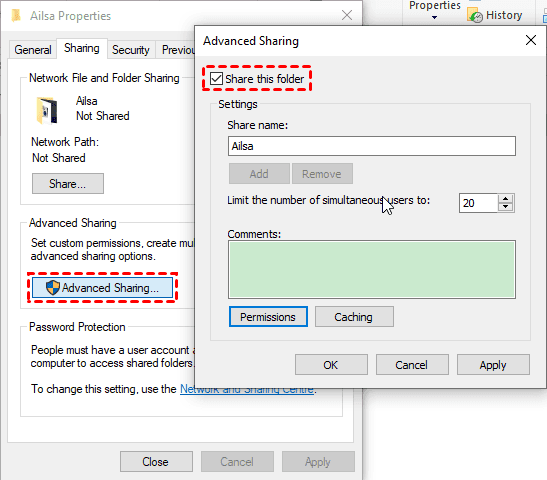 - Click on the Sharing tab. Then, under the Advanced Sharing section, select the Advanced Sharing...button and tick Share this folder,