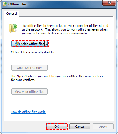 2. In the pop-up window, click Enable offline files and OK. Then, restart your computer to make changes take effect.
