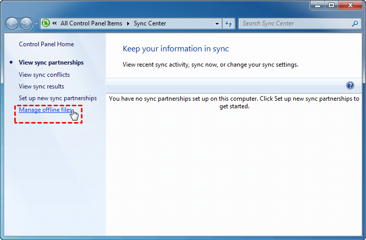1. Click the Start button > All Programs > Accessories > Sync Center to open the Sync Center. Then, click Manage offline files on the left pane.