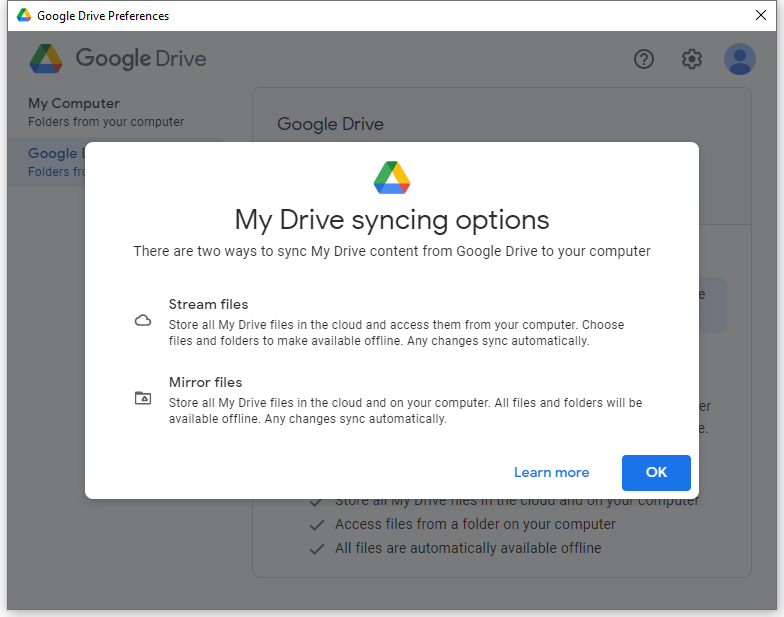 - "Mirror files" will store all files in both the cloud and your computer. All the files and folders will be available offline and of course, it will take up more of your disk space.