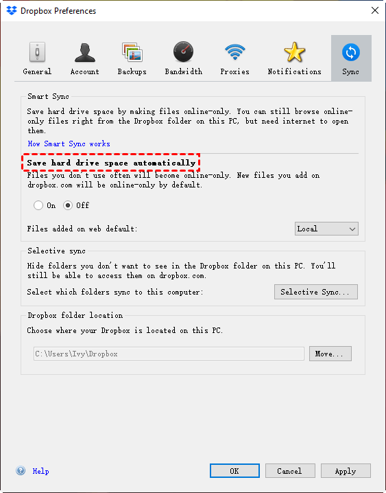 Step 3. If you don't want to change it one by one, you can enable Smart Sync in the Dropbox Preferences. Go to the Sync tab and then Smart Sync > tick On under Save hard drive space automatically and set the file added to web default as Local or Online Only.