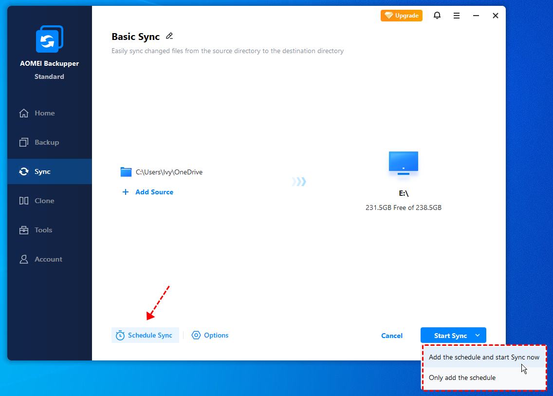 5. After that, click Start Sync > Add the schedule and start sync now or Only add the schedule. Then the contents in the OneDrive folder will be synced to your external drive as you configured.