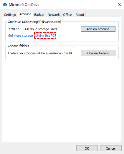 2. Click the Account tab and select Unlink this PC. A OneDrive setup screen will pop out, and just ignore it for now.