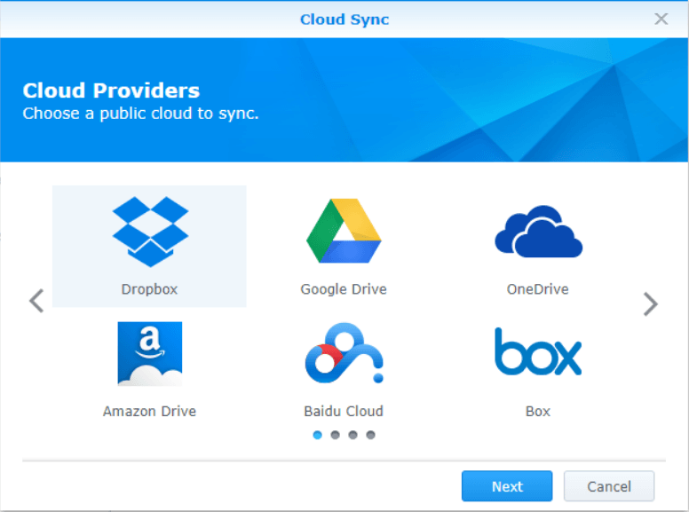 To help to sync files between Synology NAS and public cloud services, Synology provides users with an application called Cloud Sync. It supports various cloud services, like Amazon Drive, Dropbox, and OneDrive. Take Dropbox as an example. Follow the steps below to run Synology two-way sync with Dropbox: