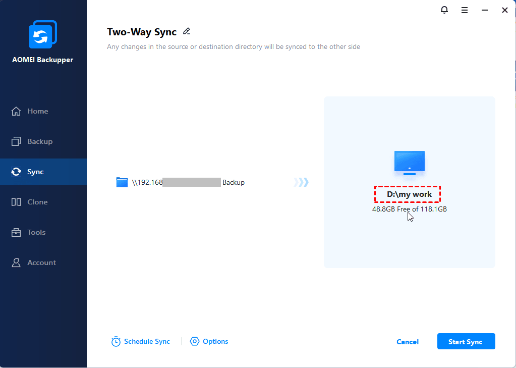 AOMEI Backupper Professional can be the best Synology Cloud Sync alternative. It runs smoothly on Windows 11/10/8.1/8/7/Vista/XP. It allows you to sync files between two folders, drives, or computers. You are also allowed to sync NAS with a cloud drive, such as sync QNAP to OneDrive.