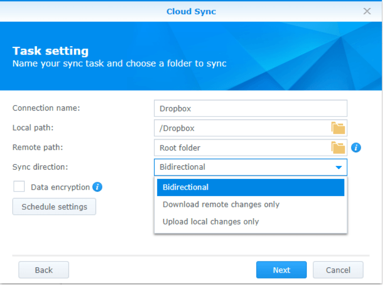 Choose “Bidirectional” in “Sync direction”. This option will sync files from Synology NAS to the cloud service and vice versa.