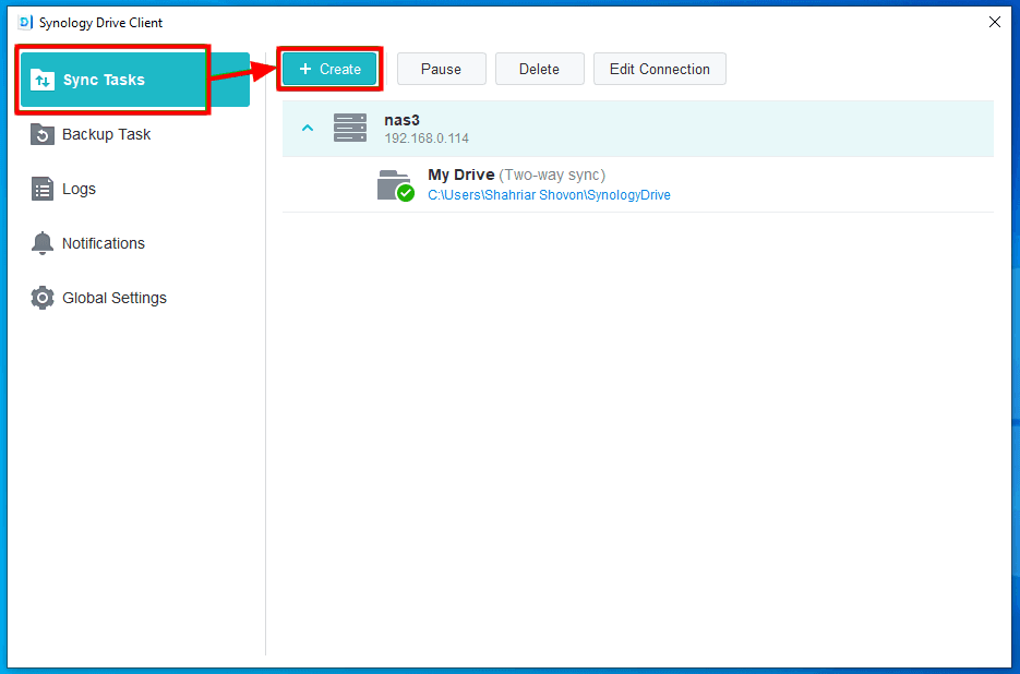 - Then a new Sync Task should be created. You can click on Create from the Sync Tasks section on Synology Drive to sync multiple folders.