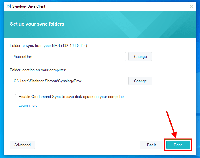 - Then you can set up your sync folders. By default, the /home/Drive folder of your Synology Drive will be synced with the folder C:\Users\\SynologyDrive of your computer. To change the sync folder of the Synology Drive, click on the Change button. You can also change the folder on your computer that will be synced with your Synology Drive folder.