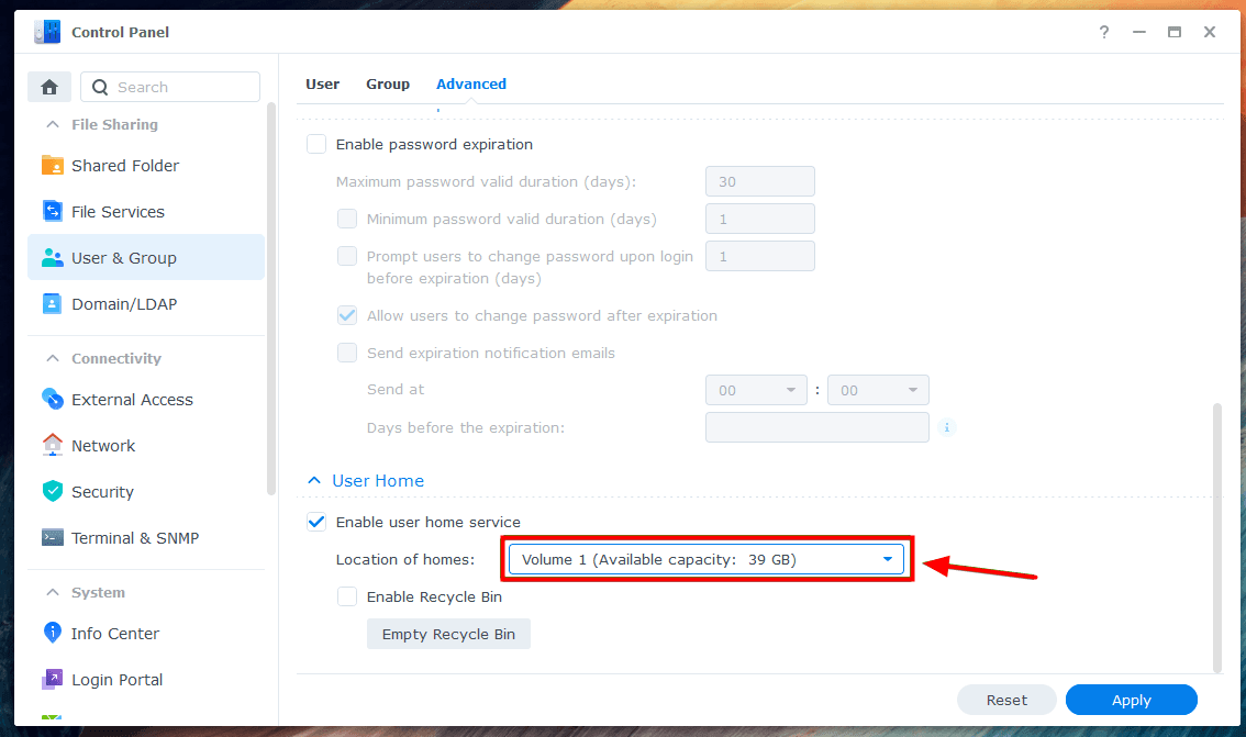 - Then, you can select the volume you want to store the Synology Drive user files from the Location of homes drop-down menu. Once you’re done, click on Apply.