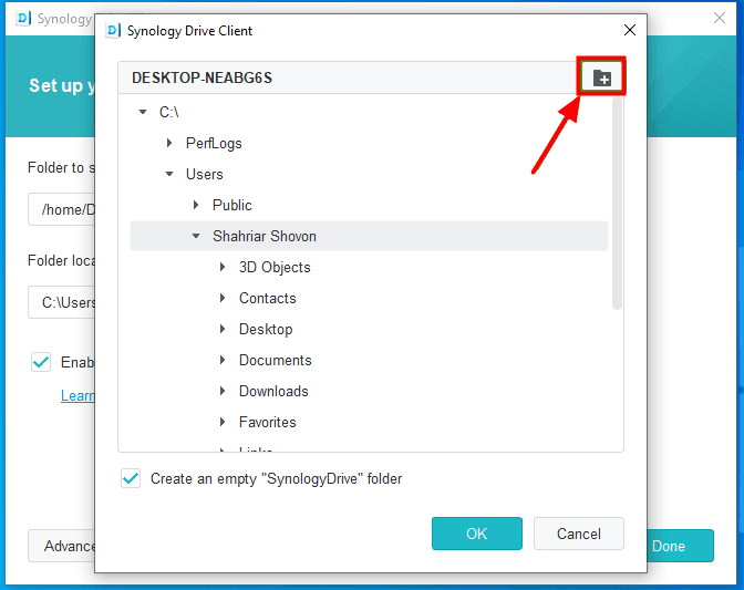 - All the available folders of your Synology Drive or on your computer should be listed. You can select a folder to sync from here. If you want to create a new folder in your Synology Drive, click on the new folder icon.