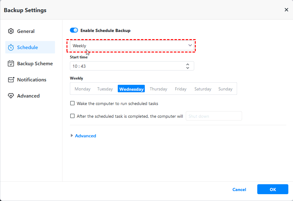 It is able to perform Gmail backup Synology automatically if you enable the “Schedule Backup” feature in daily, weekly, monthly and event triggers, even waking your computer at a specific time.