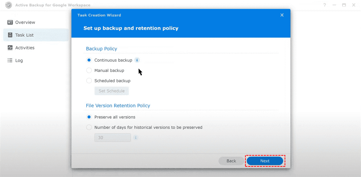Step 7. Set up backup and retention policy according to your preferences, then click Next.