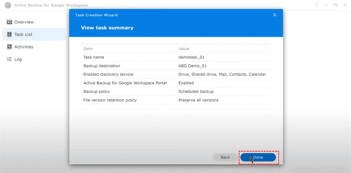 Step 8. Review the settings and click Done to initiate the backup process.