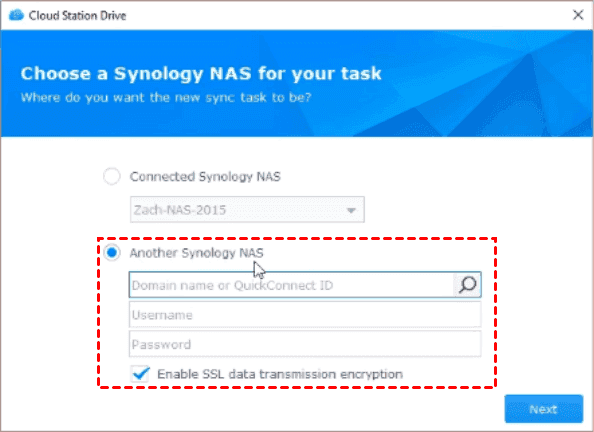 2. Choose a Connected Synology NAS or Another Synology NAS, click Next. For Another Synology NAS, please type Synology address, username and password.