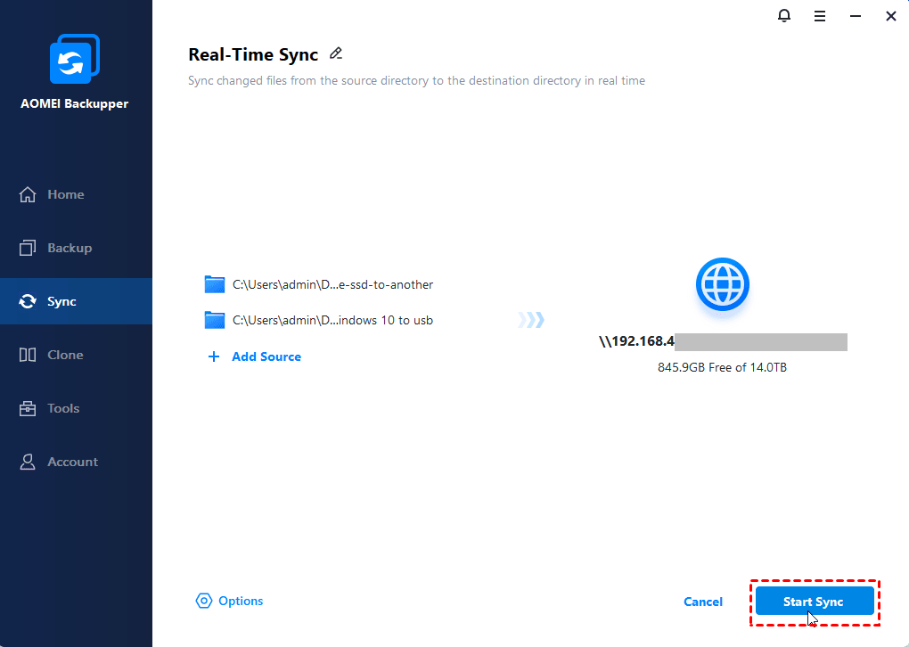 Apart from the Synology data migration tool, there is a comprehensive file synchronization software - AOMEI Backupper Professional in Windows XP, Vista, 7, 8, 8.1 and 10 (32-bit and 64-bit). It helps you perform Synology sync folder in simple steps with PC and provides you with different sync solutions and settings to meet your different needs.