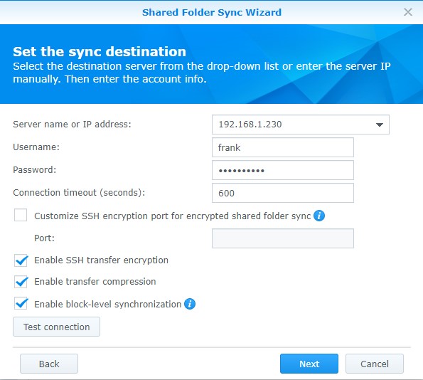 - Enter the details for the destination Synology NAS, adjust the settings at the bottom according to your preferences, and proceed to test the connection.