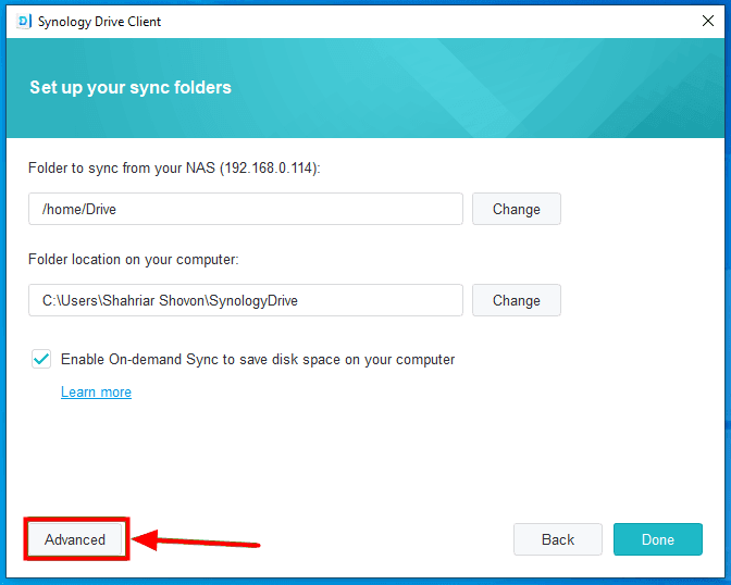 - Then you can set up your sync folders. By default, the /home/Drive folder of your Synology Drive will be synced with the folder C:\Users\Username\SynologyDrive of your computer. To change the sync folder of the Synology Drive, click on the Change button. You can also change the folder on your computer that will be synced with your Synology Drive folder.