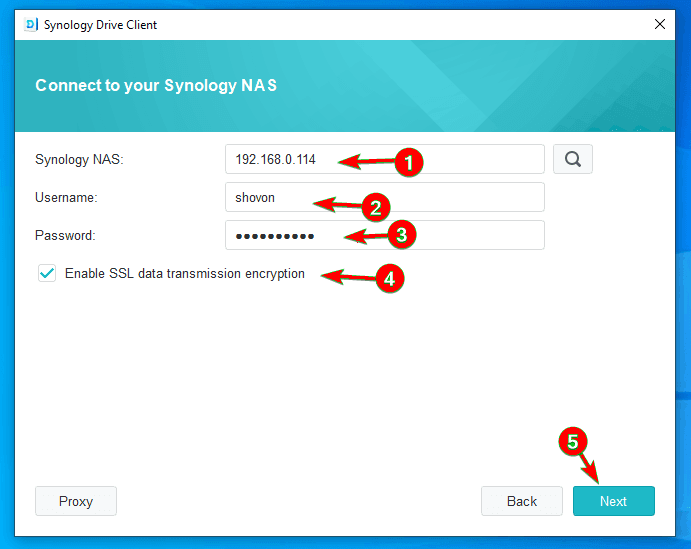 - Type in Synology NAS, Username and Password. To use SSL encryption, make sure to check the Enable SSL data transmission encryption. Once you’re done, click on Next.