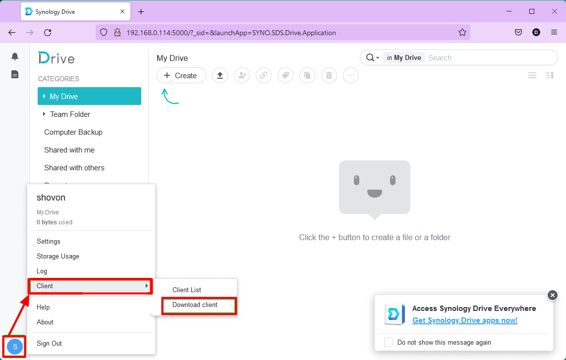 - Then log in to your Synology Drive web application and click on Client -> Download client from the user menu. Then download the Synology Drive Client installer according to the prompt.