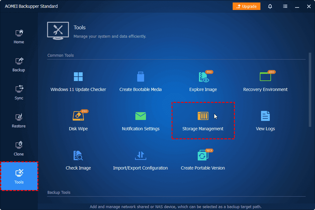 If you have created sync tasks with different NAS devices, you can go to Tools > Storage Management to manage your NAS storage.