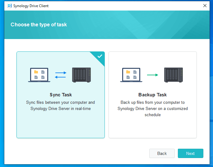 Answer: “Sync Task” allows you to sync files from your computer to Synology Drive Server and vice versa in real time. “Backup Task” only allows you to backup files from your computer to Synology Drive Server on a customized schedule.