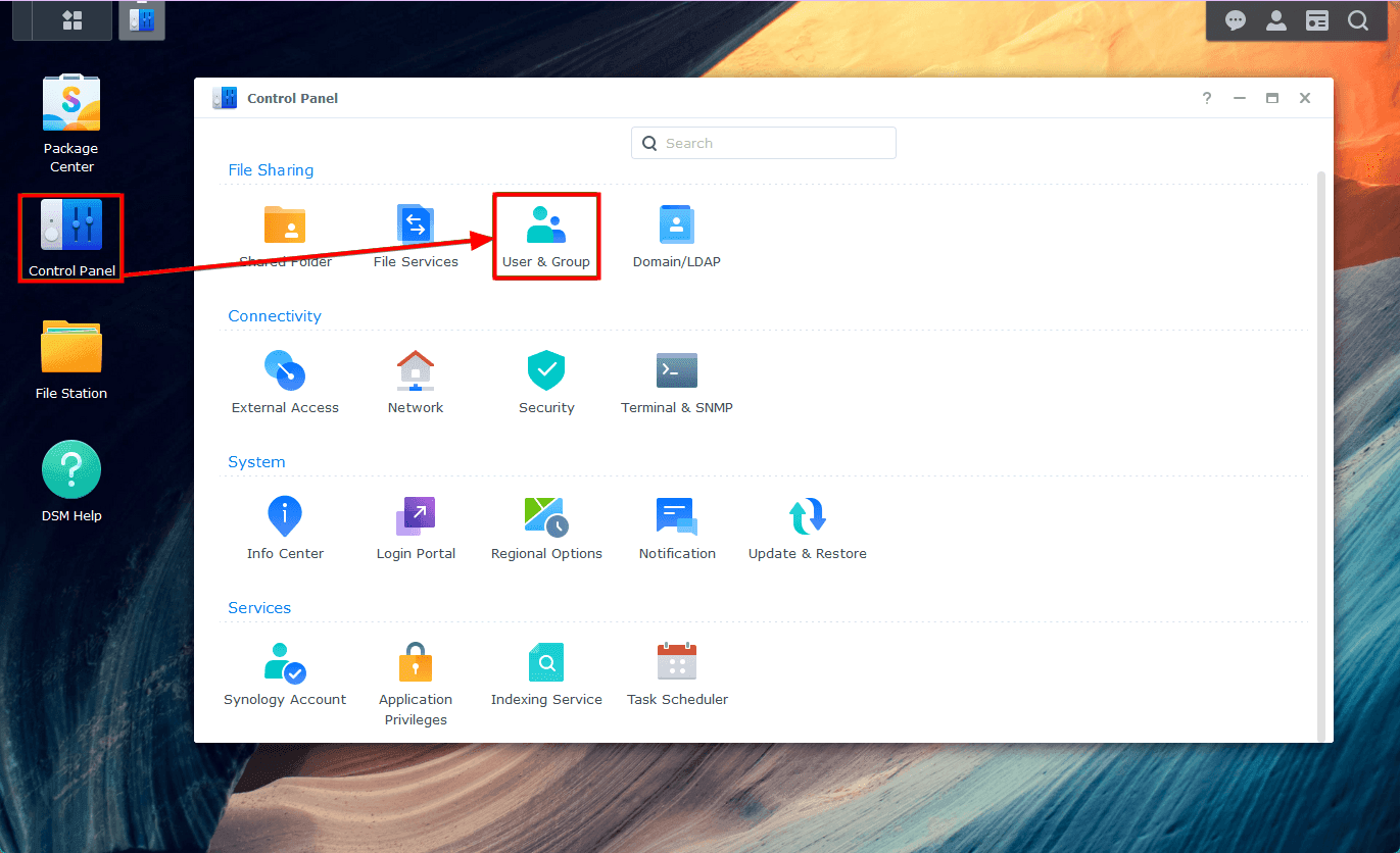 - For each NAS user who wants to store files and access their home directories on Synology Drive, you must enable the user home service on the Synology NAS. To enable the user home service, navigate to Control Panel -> User & Group.