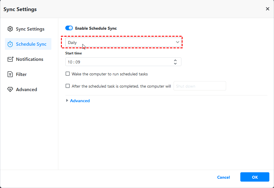 - Daily, Weekly, Monthly: It is to sync files from every 1 hour to 6 hours in a day, or use weekly and monthly.