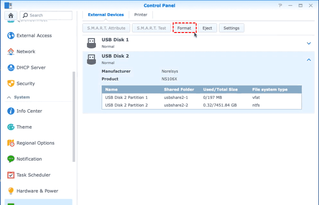 # 4: Check the file system on external drive. For now, Synology claimed that only Btrfs (Linux), ext3, ext4, FAT, FAT32, exFAT, HFS, HFS Plus, and NTFS file system could be recognized on Synology NAS. For other file systems, you need to format it before using it for Synology sync external drive.