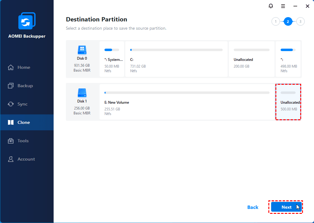 ● Sector by sector clone: it will clone every sector on the source partition no matter it is used or not, thus costing more time. It requires the destination partition to be equal to or larger than the source partition.