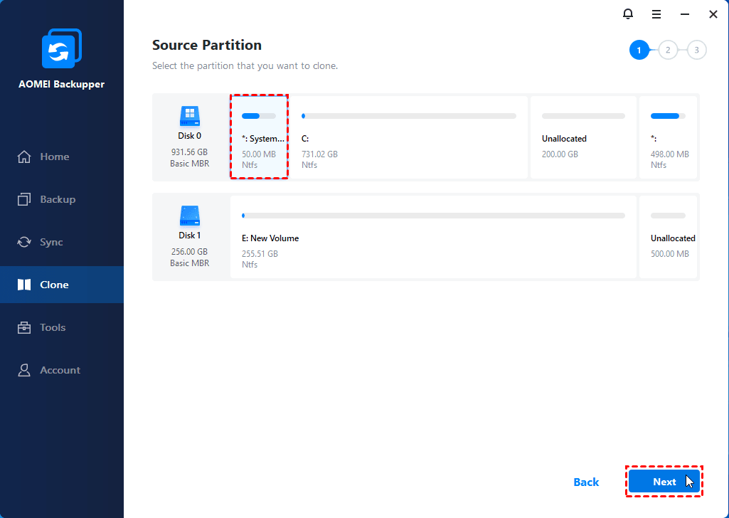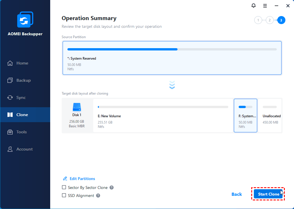 Instead of creating a new System Reserved partition, I’ll tell you how to copy the original System Reserved partition to the drive you want here. What you need is the best disk cloning software AOMEI Backupper.
