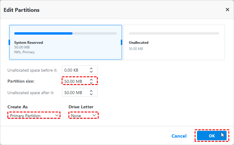 Step 4. In the Operation Summary page, click “Edit Partition”. In the pop-up window, the destination partition is set as “Primary Partition” by default so as to make it bootable later. Set the drive letter as “None” and adjust the partition size based on your need. Then, click “OK” to save your settings.