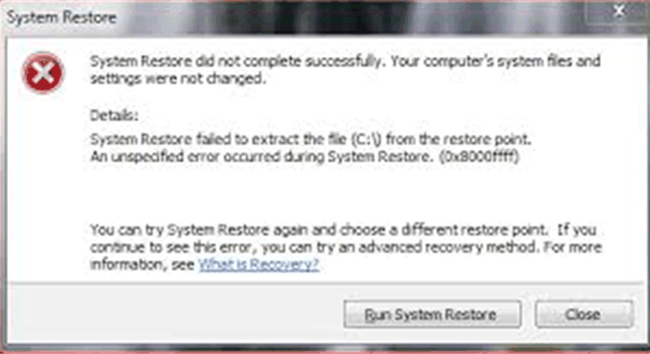 “An unspecified error occurred during System Restore. (0x8000ffff).” System Restore did not complete successfully 0x8000ffff occurs because certain files are not replaced correctly if a file conflict occurs during the restore process. To solve this problem, you can try a different system restore point.