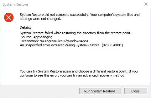 “An unspecified error occurred during System Restore. (0x80070091).” This is because something is broken in AppxStaging. You may rename the WindowsApps folder, reboot the system and try a system restore to fix the issue. Let’s see how to rename the WindowsApps folder in Safe Mode.