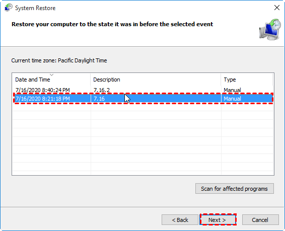 Tips: If you want to know what programs will be deleted or restored using this restore point, you may click Scan for affected programs to check.