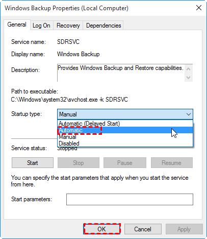 2. Double click Windows Backup to open its setting. Select Automatic in Startup type. Click OK to save the setting.