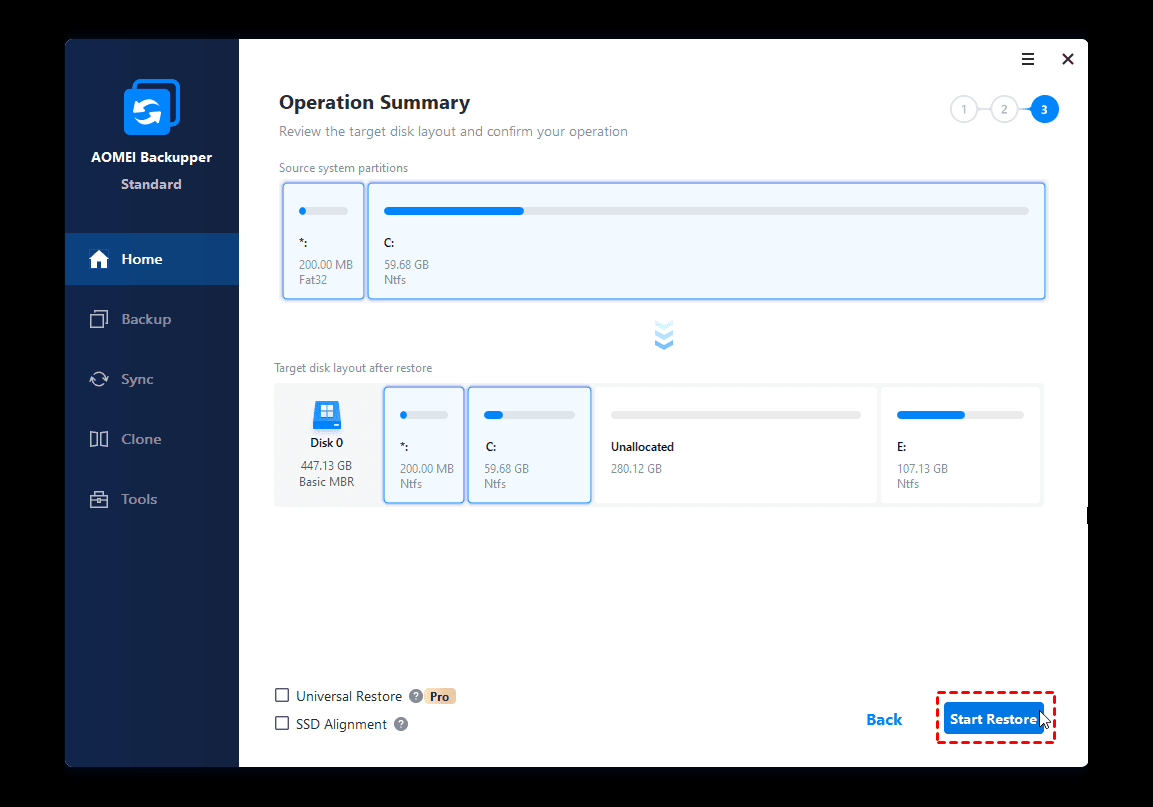 If you want to restore your system to dissimilar hardware, you can click Universal Restore. This feature is supported by AOMEI Backupper Professional. You need to upgrade to the advanced version to enjoy this function.