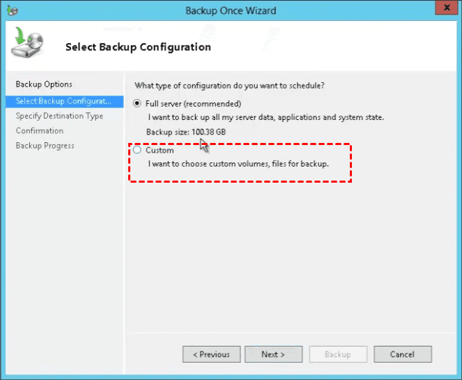 Step 4. Choose Custom if you only want to create a system state backup in Windows Server 2012 R2 domain controller and click Next. You can also backup a full sever including the system state backup.