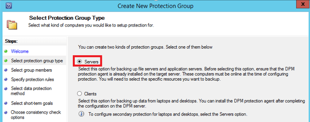 Step 2. Select Servers>next on the Select Protection Group Type page.