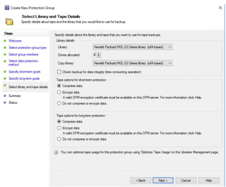 2. On the Select Tape and Library Details page, choose the tape and library for backup. Also, specify preferences for compression and encryption of data.