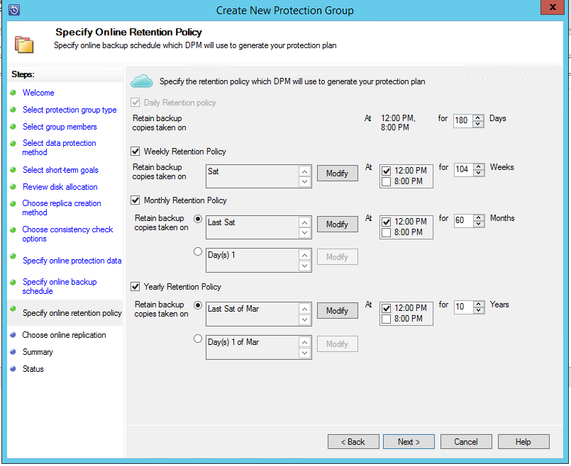 Step 12. On the Specify Online Retention Policy page, specify how Azure retains the recovery points from daily, weekly, monthly, and yearly backups.