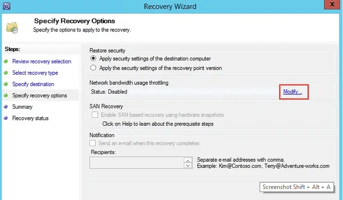 Step 5. On the Specify Recovery Options page, select security settings and decide whether to use SAN-based hardware snapshots for faster recovery. This option requires a compatible SAN and a network connection between the protected and Backup Server computers.