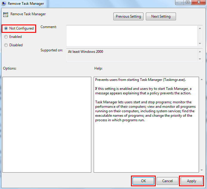Step 3. Double-click Remove Task Manager. If you find the setting is set to Enabled, then that means it will prevent you from opening the Task Manager. You can check Not Configured/Disabled, and click Apply and OK to confirm.