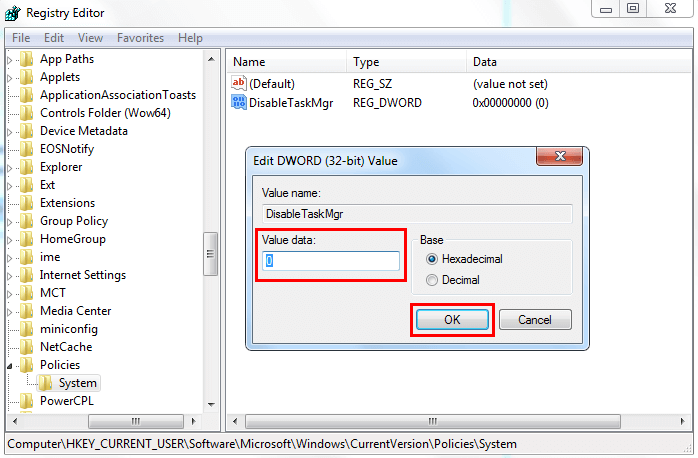 Step 4. Double-click DisableTaskMgr and set the value to 0 and click OK to confirm.
