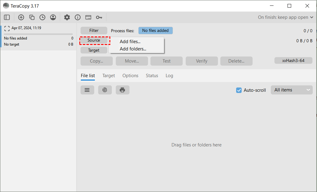 Step 2. Click on Source to select Add files or Add folders to choose the items you want to transfer.