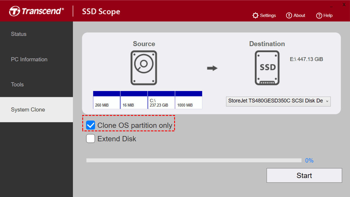 - Uncheck the first option if you want to clone hard drive to Transcend SSD instead of OS only.
