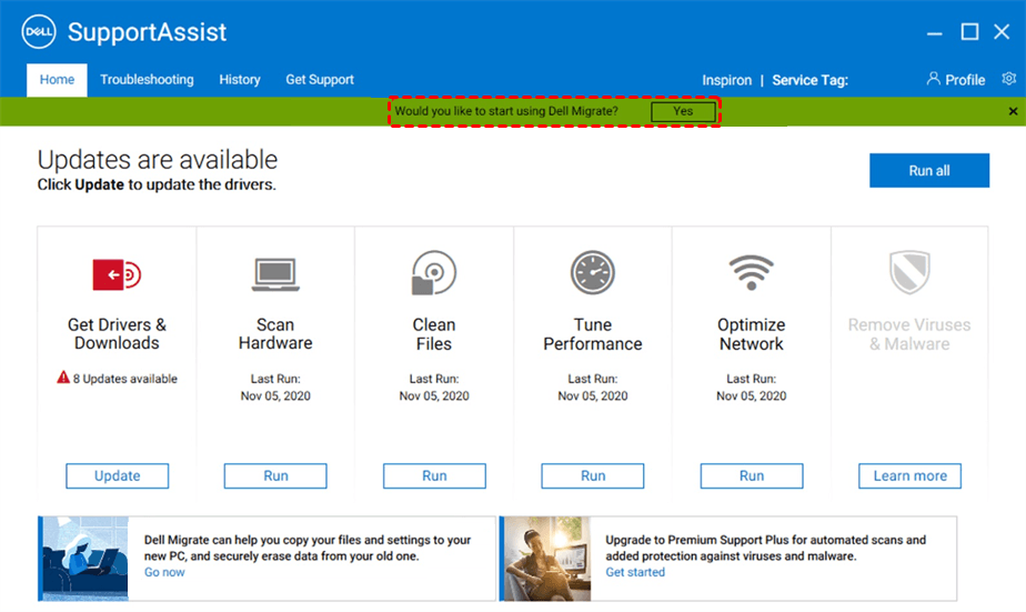 2. Click Yes to start using Dell Migrate and then Let's get started, it will start to search for your files and settings on the old PC.