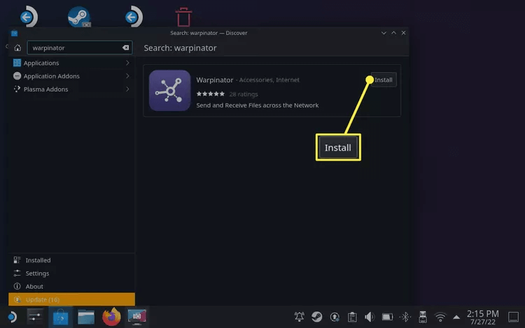 Step 2. Locate the Steam Deck icon in the lower right corner and open Discover. Next, tap on Search, type Warpinator, and select Install to begin the installation process.