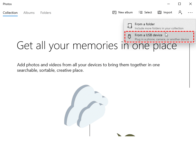 2. Click Import in the top-right corner of the Photos app, and then select From a USB device.
