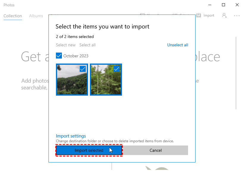 3. The Photos app will scan the drive and present a list of photos it found. Click Import selected to start importing your photos.